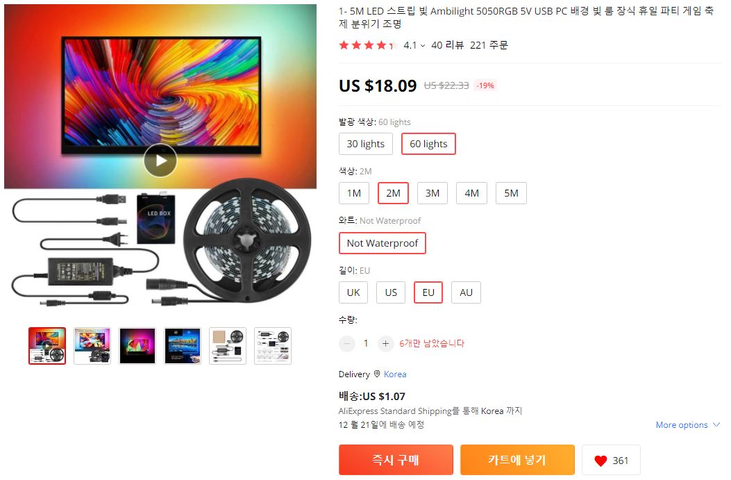 이번에 리뷰할 제품은 앰비언트 LED 라이트 스트랩입니다. 흔히 간접조명, 무드등, 엠비언트 라이트 등으로 불립니다. 일반 모니터를 비싼 게이밍모니터 부럽지 않도록 모니터 화면의 색상에 따라서 LED 라이트 색상이 같이 변화합니다. 보통 이런 기능을 가진 브랜드 제품은 가격이 상당히 비싼편인데, 저는 알리익스프레스에서 2만 초반 가격에 구했습니다.