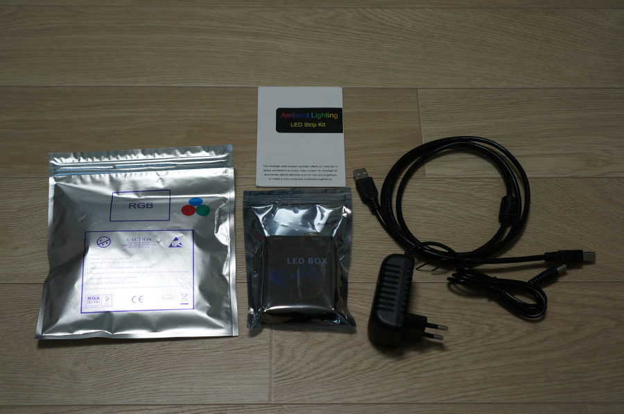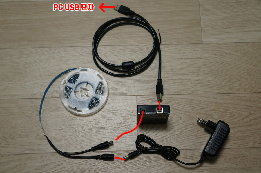 LED 스트랩과 제어박스, USB케이블, 전원아답터로 구성되어 있습니다.