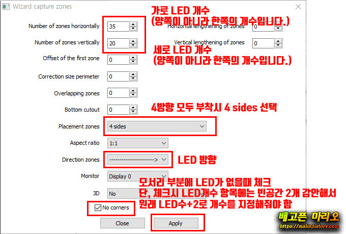 저 같은 경우는 모서리쪽에는 LED가 없기 때문에 No corners 항목에 체크를 해 주었구요.