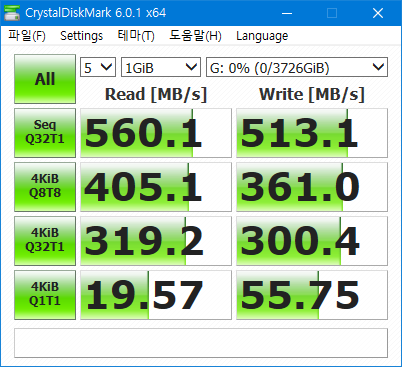 외부 USB3.0 으로 연결해서 측정한 결과값이라서 SATA3보다는 좀 작게 나오지 않았나 싶습니다.
