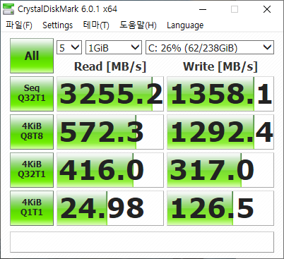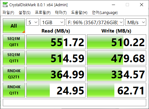 용량을 96% 까지 채워서 (여유공간은 159기가) 속도를 다시 측정해 보았습니다.