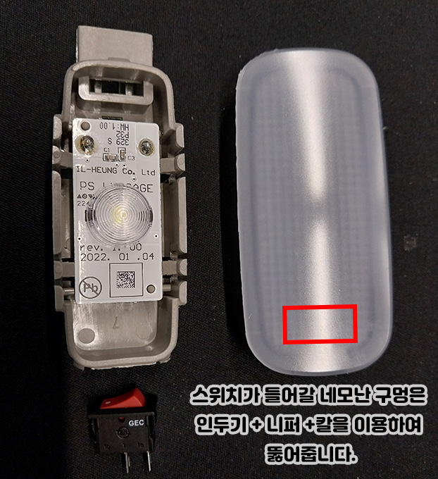 스위치가 들어갈 네모난 구멍을 커버쪽에 뚫어줍니다.